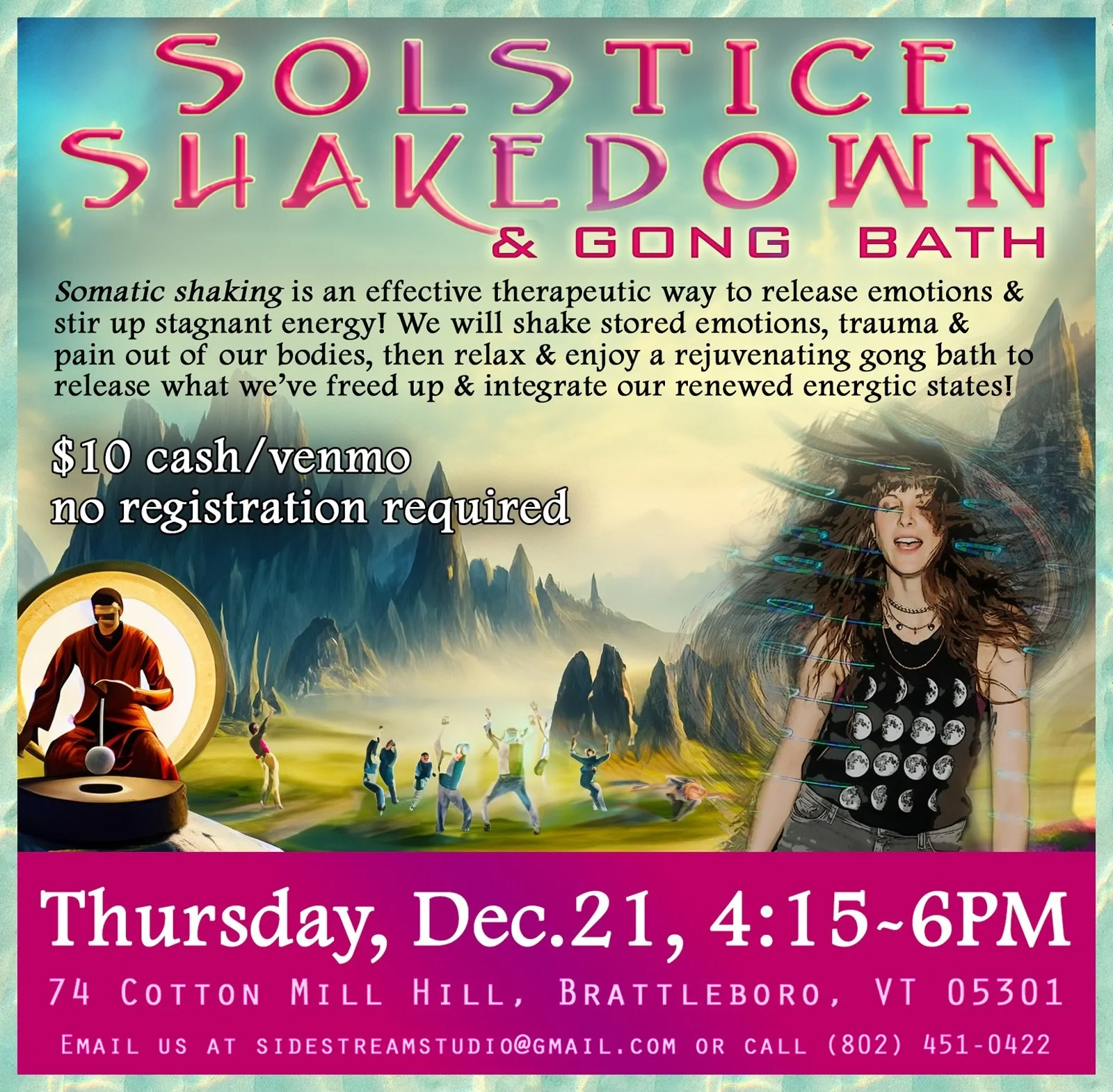 Join us at Sidestream Studio on Thursday, December 21 at 4:15 PM for an hour of somatic shaking with Toni Nagy followed by a rejuvenating gong bath from Seth Chatfield! Somatic shaking is an effective way to release emotions and past traumas and stir up stagnation, moving through obstacles and making room for renewal and growth. After we shake (at the pace that works for you), we will relax and enjoy a rejuvenating gong bath, integrating everything. No registration is required, attendance is $10 at the door cash or Venmo.
